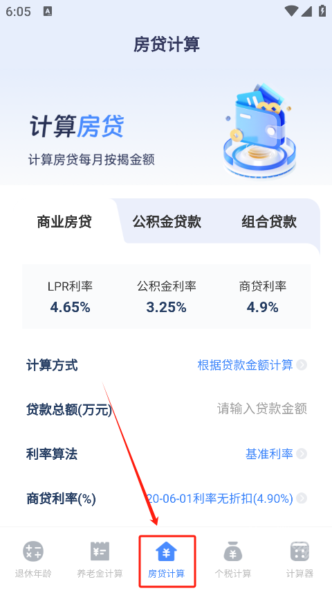 退休计算器具备房贷查询功能。点击“房贷计算”选项,输入房贷总额、还款期限等相关信息,就能快速获取每月的房贷还款金额。