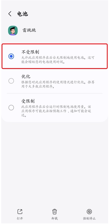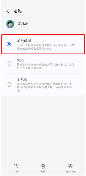 电源优化安卓系统会对应用进行电源优化,被优化的程序不能长时间在后台运行。所以为了保证雷跳跳的稳定运行,需要设置其电源优化级别为不优化或无限制。