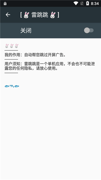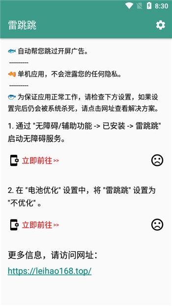 在魔趣网下载雷跳跳并安装,之后打开该软件。雷跳跳默认情况下可以跳过大部分包含关键字的开屏广告,不过对于一些做了专门防御的广告,可能会因为无法检测到相关控件而导致跳过失败。