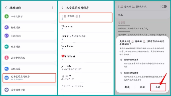首先开启无障碍服务,在首页点击“立即前往>>”即可快捷跳转至开启页面;点击后,依次通过“已安装”选项找到“[雷跳跳]”,并授予该应用无障碍权限(部分系统的手机可能会弹出警告提示,可放心授予权限)。