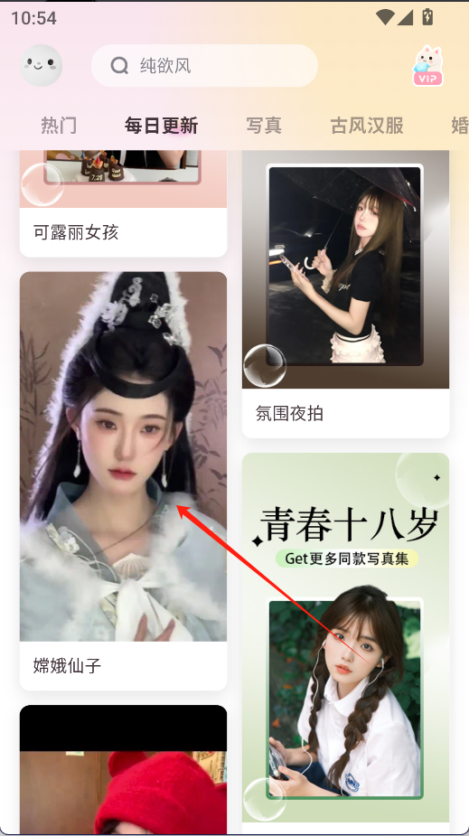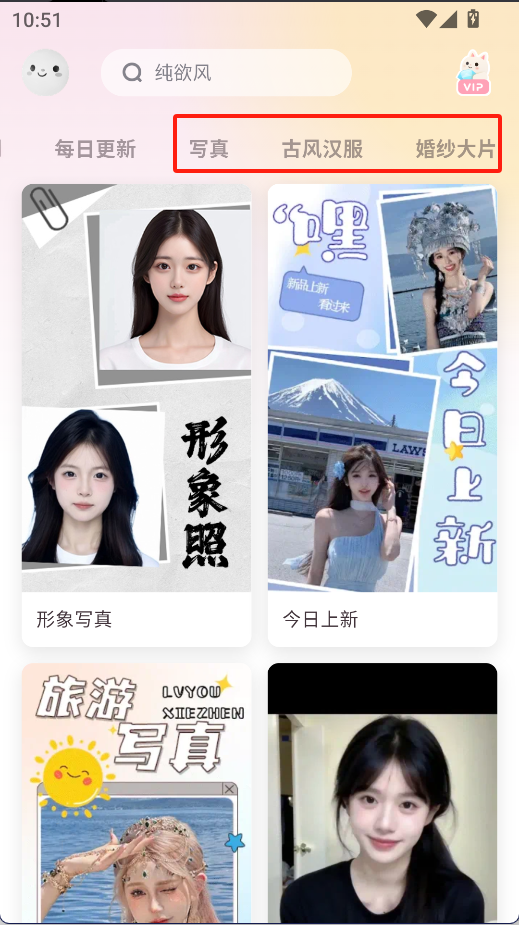 进入软件主界面后,可浏览并选择写真、古风等不同的拍摄模式。
