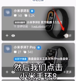 在首页向下滑动,您可以找到小米手环的相关信息。点击“更多”选项,接着选择“小米手环8”。继续向下滑动,您就能看到表盘智能工具的最新版本。