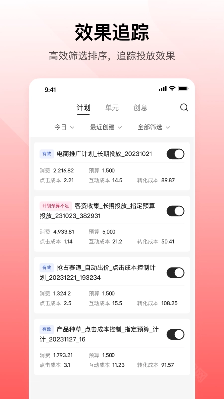 灵活调整推广策略:可随时对预算、出价、定向及投放日期等推广设置进行便捷修改。