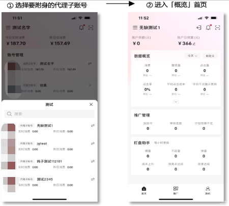 进入附身登录页面,选择需要进行附身登录的代理子账号后,即可进入【概览】首页。
