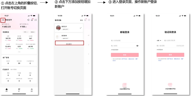 点击左上角的折叠按钮,进入账号切换界面→点击下方的添加按钮来新增小红书广告账户→跳转至登录页面后,对新的小红书广告账户进行登录操作