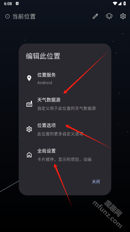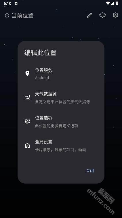 点击那个形似“笔”的图标,就能对“天气数据源”“位置选项”和“全局设置”进行自定义配置。