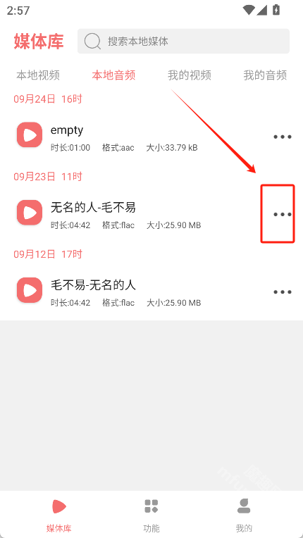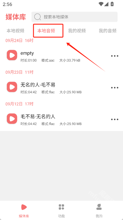 点击“本地音频”选项,就能在此处查看手机里存储的全部音频文件。