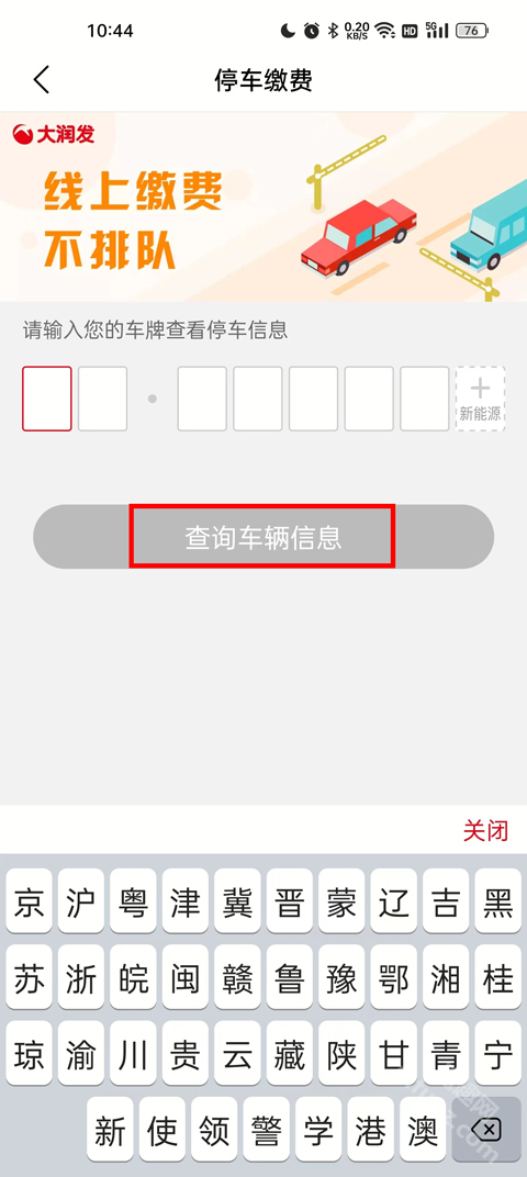 在停车缴费页面输入车牌信息,点击查询车辆信息。