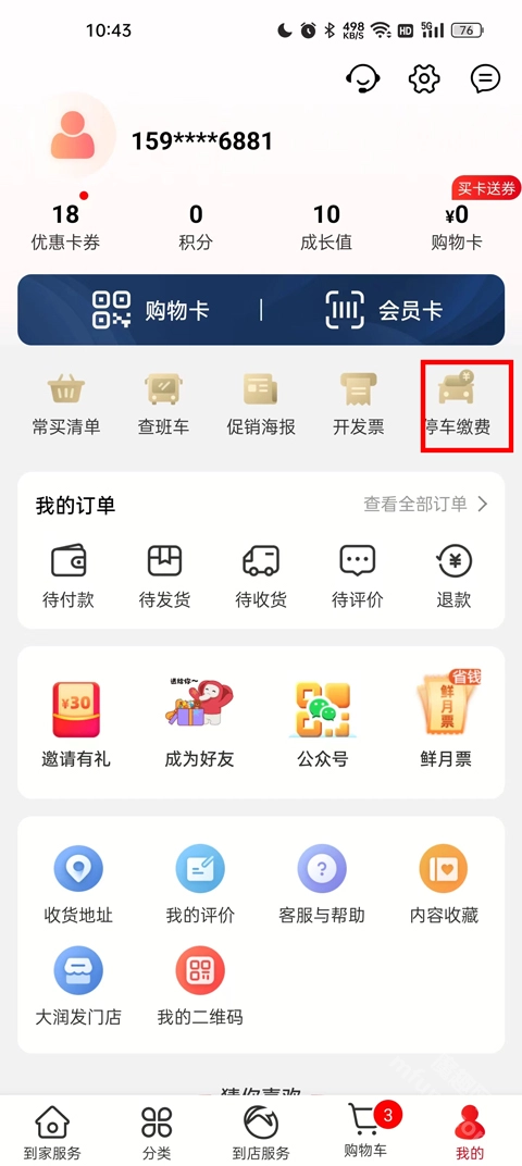 在我的页面里,找到会员卡下方的【停车缴费】选项,点击它就能进入相关页面啦。