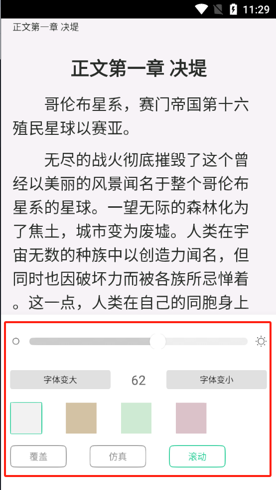 阅读设置:点击小说进入阅读界面后可以调整字体大小、背景颜色、亮度等,以获得舒适的阅读体验。