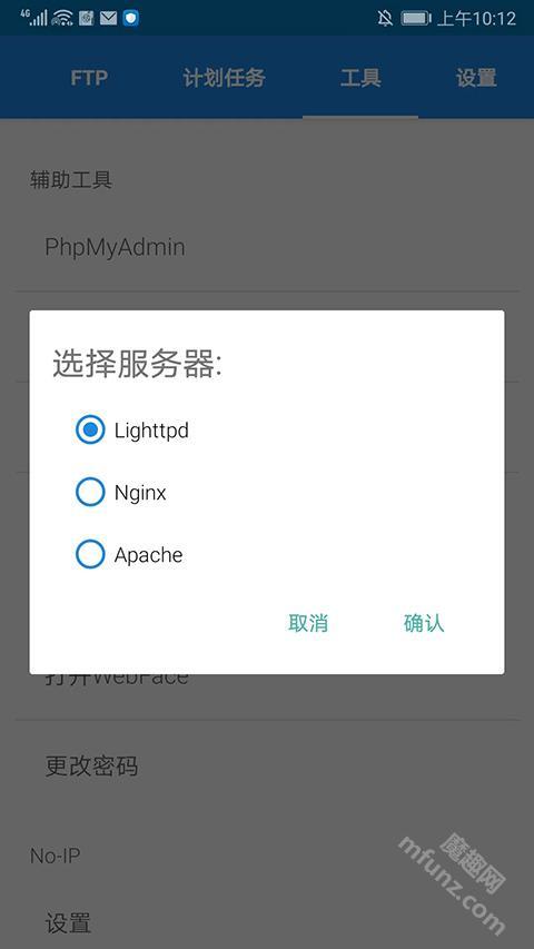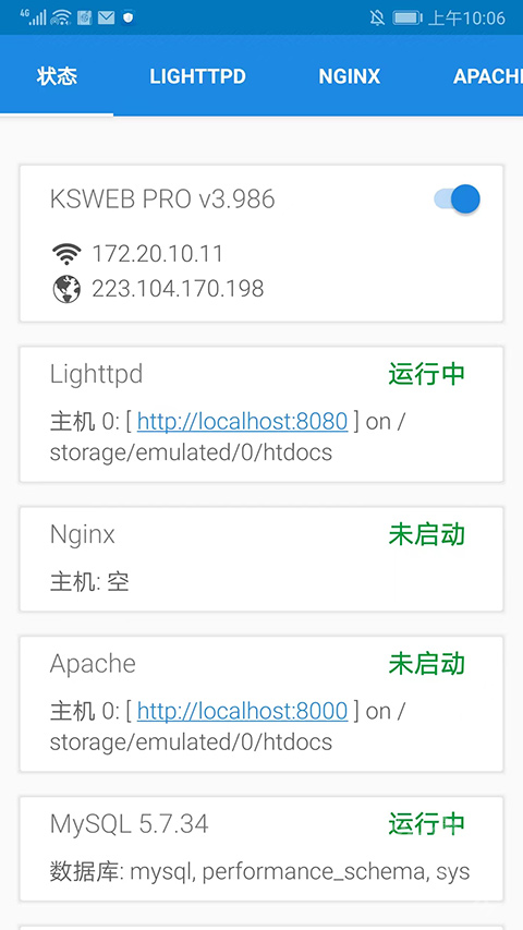 打开KSWEB应用后,进入其主界面,会看到状态、LIGHTTPD、NGINX、APACHE、MYSQL、PHP、FTP等多个分栏,用户能够依据自身需求选择使用,下面就以【NGINX】为例进行说明。