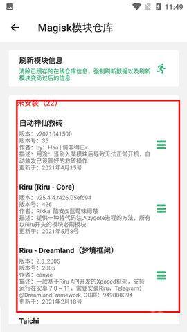 进入Magisk模板仓库后,这里有不少功能框架,找到需要的点击即可。
