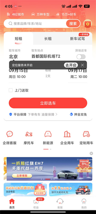 然后打开应用,按照自身需求挑选合适的租车类型,比如短租、长租或者试驾等。