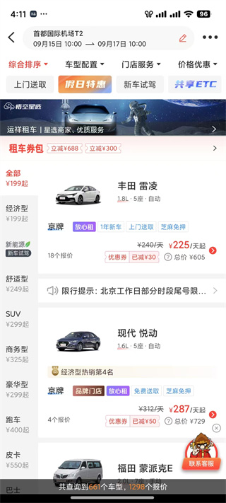 - 千余种车型:涵盖经济型、舒适型、商务型、SUV、豪华车以及新能源车,品类丰富齐全。