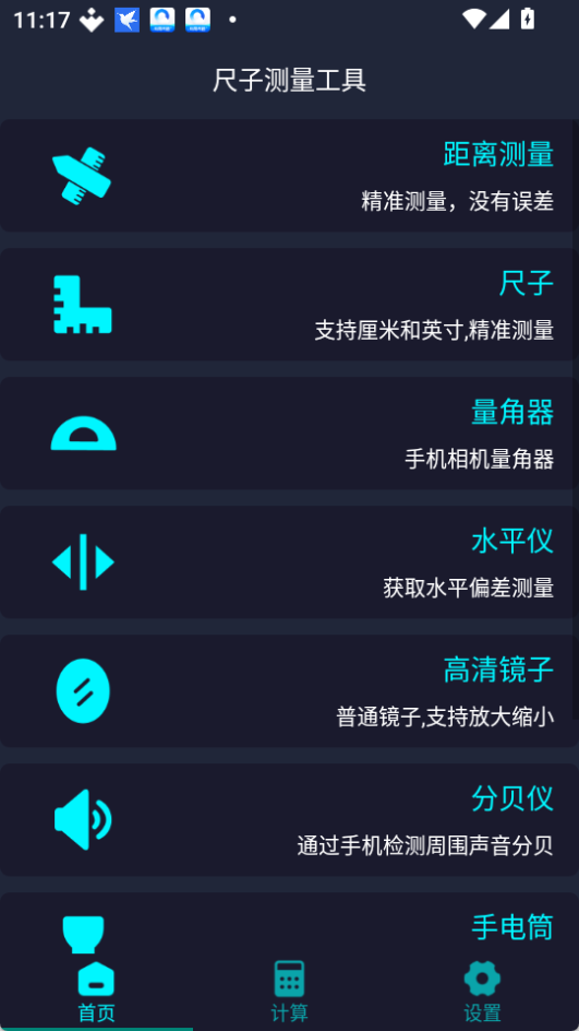 尺子电子版是一款集成了多种实用功能的测量工具,涵盖距离测量、尺子、量角器、水平仪、高清镜子、分贝仪、手电筒,以及汇率转换、大写数字转换、亲戚称呼计算、日期计算、进制转换、万能公式等功能。尺子功能支持厘米和英寸单位,能够帮助我们实现精准测量;量角器功能相当于手机相机量角器,高清镜子功能还支持放大缩小操作。