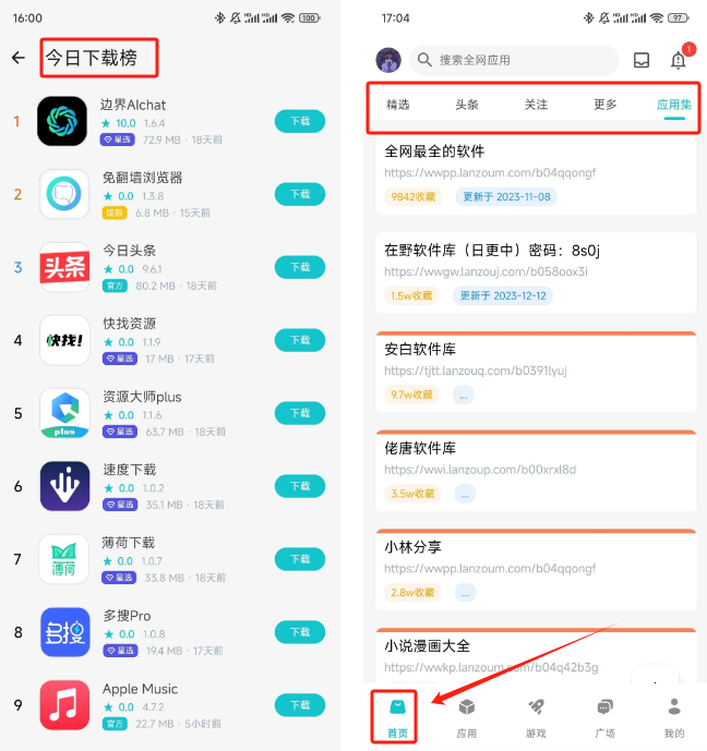 软件首页呈现了各类精选软件,涵盖好评榜单、综合排行榜等内容。除此之外,平台还设有头条资讯、关注动态、应用合集等不同页面板块。