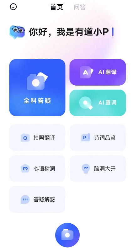 在首屏点击最左侧的“有道小P”图标,即可进入提问页面。