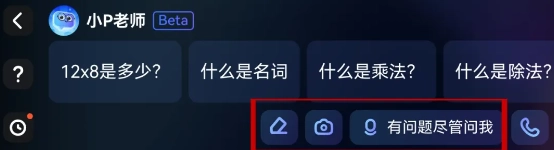 右下角的三个按钮,从左往右依次为扫描、拍照和语音输入,点击对应的按钮就能向小P提问啦。