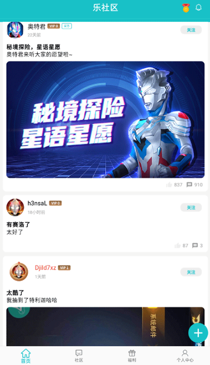 乐社区是一款围绕奥特曼元素打造的游戏社区应用,设有首页、社区、福利和个人中心四大板块。在这里,用户既能购买奥特曼周边商品、安装奥特曼游戏,还能浏览奥特曼相关的抖音视频分享合集,绝对是每一位怀揣奥特曼情怀的玩家不容错过的优质应用。