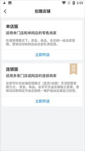 若要创建店铺,可点击右上角的“创建”按钮,然后根据需求选择单店版或连锁版。