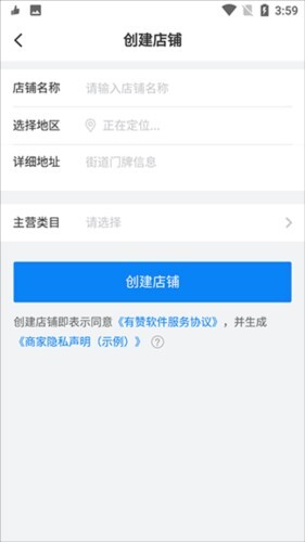 只需填写店铺名称、所属地区、详细地址和主营类目,就能完成创建。