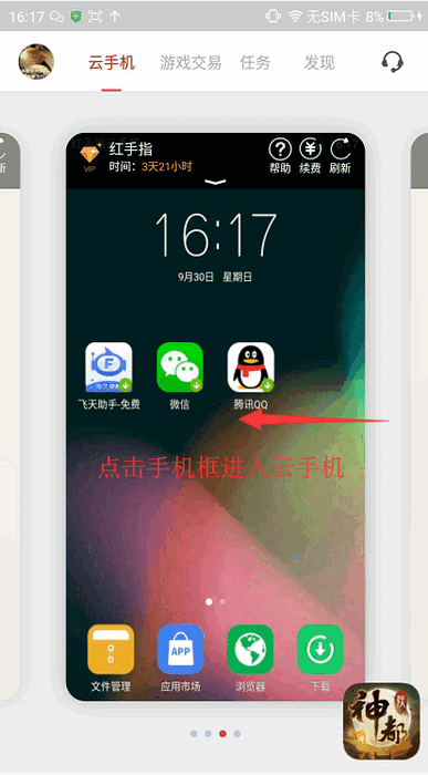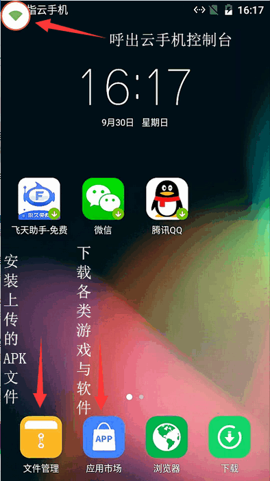 以下是云手机的操作步骤:①进入虚拟桌面后,点击“应用市场”应用(在应用市场内的应用,会在常用界面和远程桌面生成对应的应用图标,便于启动;若在常用界面卸载应用,远程桌面的应用图标会随之删除,反之同样如此)。