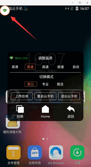 应用完成托管后,点击红手指的悬浮窗口,其中的WiFi图标所显示的就是当前的网络环境;第一栏用于调整云手机的画质,第二栏可以切换云手机的控制模式,第三栏支持上传软件,第四栏则是云手机的功能键,具备切换应用、返回云手机桌面以及点击返回退出等功能。