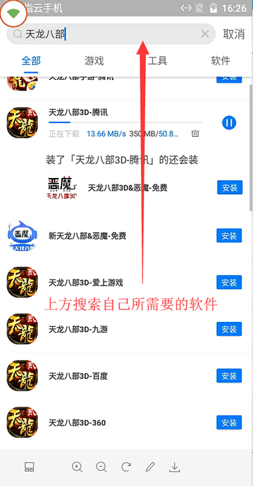 下面我们以《天龙八部3D》为例,打开应用市场,搜索“天龙八部3D”这款游戏。