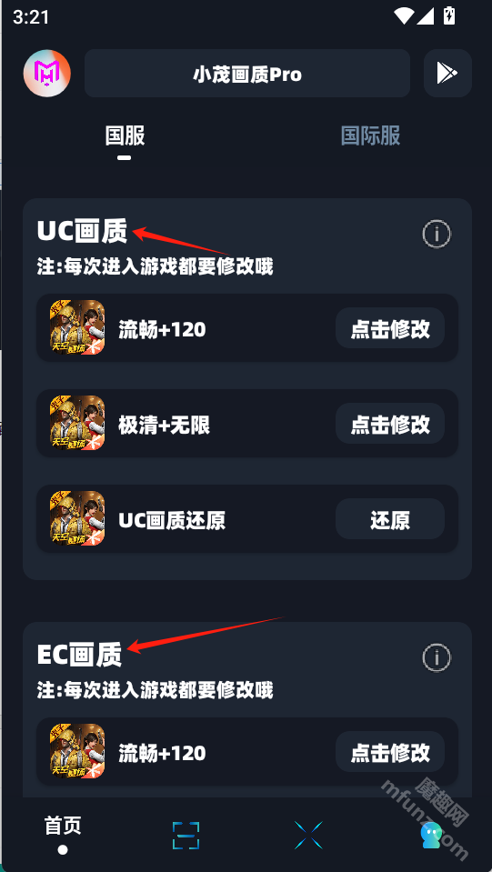 小茂画质助手pro安装后,在小茂画质助手pro首页可以进行代码DIY和配置还原操作。