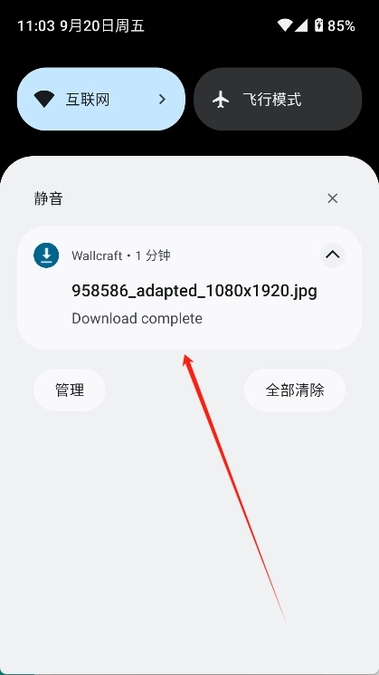 接着就会显示加载状态,等加载完成后,下拉手机的通知栏就能找到合适的壁纸,点击它就能直接跳转到对应的壁纸展示页面了。