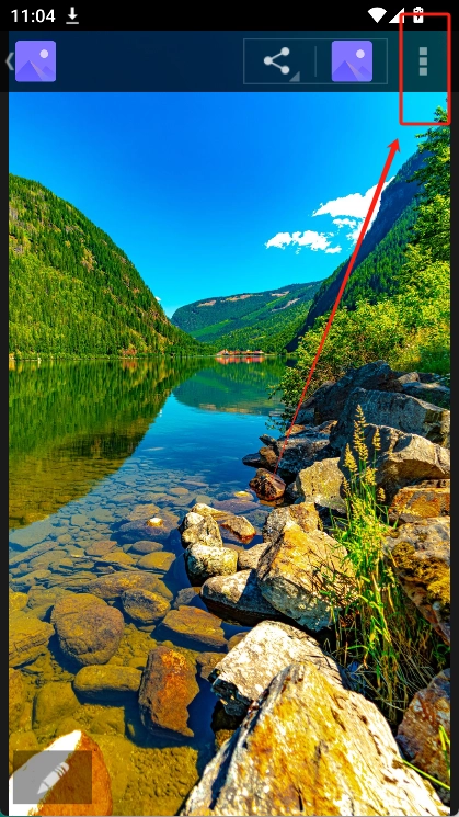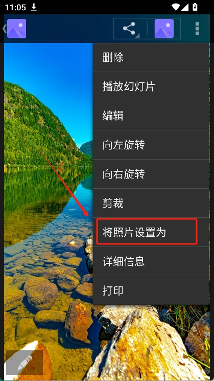 点击右上角的“三个点”图标,接着选择“将照片设置为”选项,这样就能把照片设成手机壁纸了。