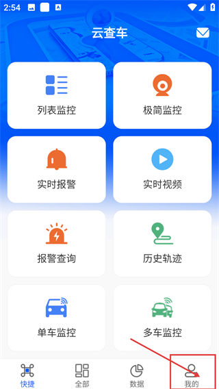 进入【云查车】后,能使用【列表监控】-【极简监控】-【实时报警】等功能,底部切换到【我的】进入个人中心。