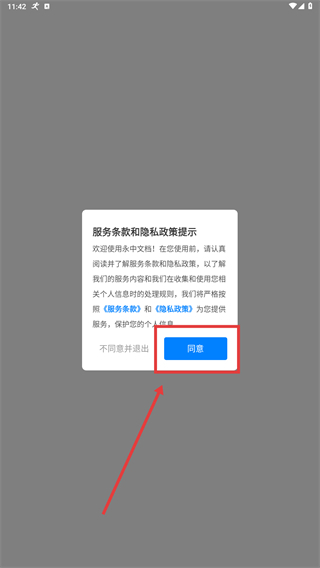 打开永中文档后,仔细阅读《服务条款》与《隐私政策》,随后点击【同意】按钮,这样就能完成协议确认并顺利进入应用界面。