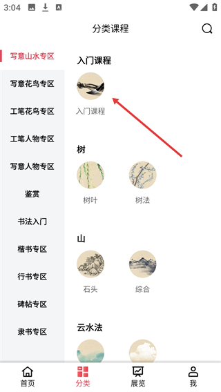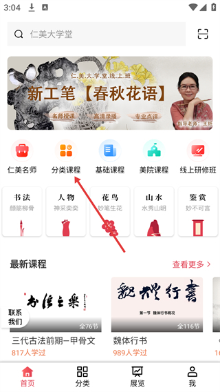 点击首页的【分类课程】选项,进入课程分类页面后,就能挑选不同艺术领域的课程专区了。