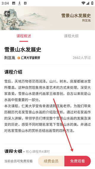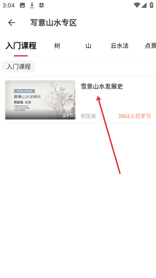 从课程列表里挑选出你想要学习的目标课程(例如【雪景山水发展史】这门课),接着点击进入该课程的详情页面。