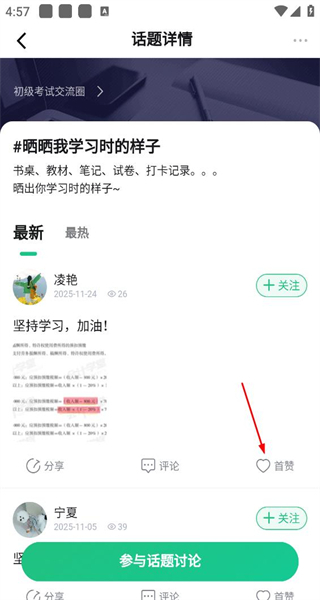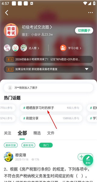 进入初级考试交流圈的详情页面后,查看置顶的考试相关内容,其中热门话题包括“晒晒我学习时的样子”,选择这个话题进入它的详情页面。