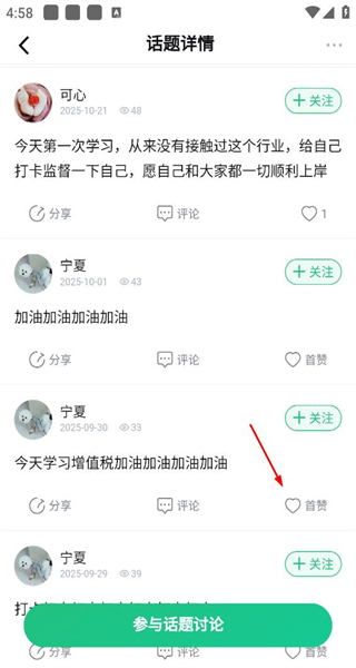 在话题详情页面浏览更多用户动态,查看不同用户的学习记录和加油内容,点击对应的首赞按钮即可完成互动操作。