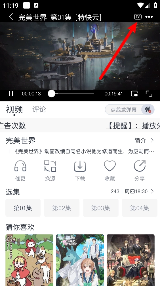 进入播放详情页,点击右上角"tv"图标。