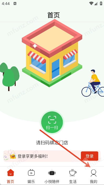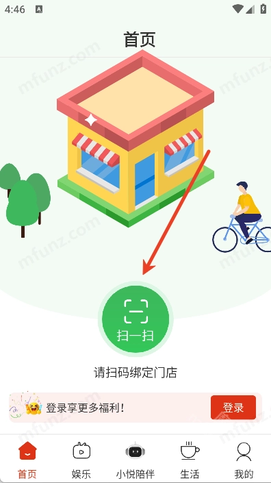 1、进入悦龄生活首页可点击扫一扫绑定周边购物门店