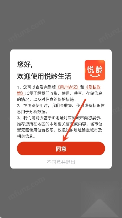 1、打开悦龄生活阅读协议并点击同意进入软件