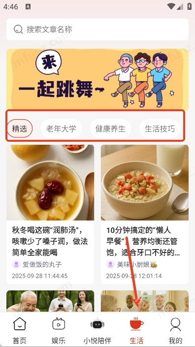 4、进入生活界面可以看到各种健康养生技巧
