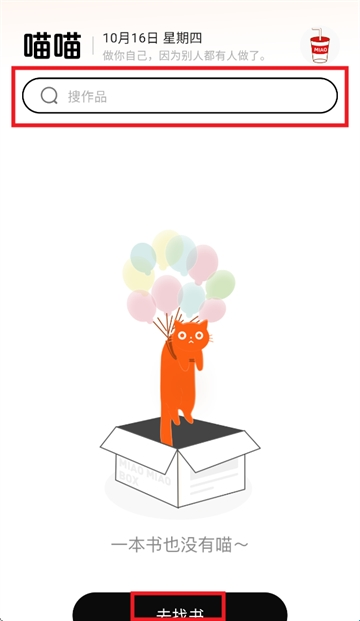 1、打开喵小乐应用,进入首页后,点击页面上的搜索框或者“找书”入口。