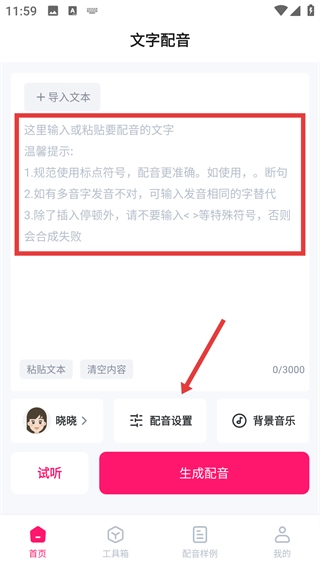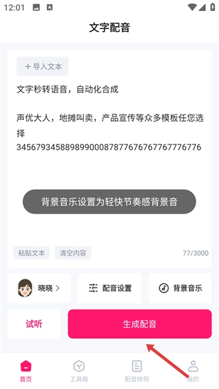 1、在首页输入或粘贴需配音的文字,挑选配音人员并完成配音设置,随后点击“生成配音”按钮。