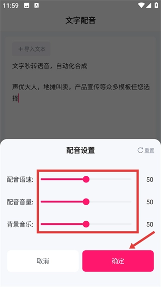 2、点击【配音设置】,调节语速、音量等参数后点击确定。