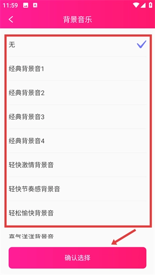 3、进入【背景音乐】页面,挑选你喜欢的音乐,然后点击【确认选择】按钮就可以啦。