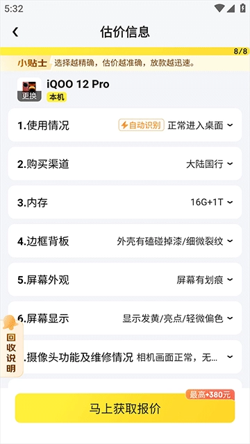 3、根据要求填写估价相关信息,点击“马上获取报价”按钮,在确认报价内容准确无误后,即可联系回收方进行回收操作。
