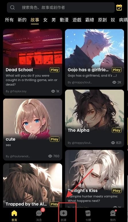 4、首页提供大量不同类型的角色与故事供用户挑选,覆盖动漫、游戏、霸总等多种风格,能够满足不同用户的兴趣喜好。