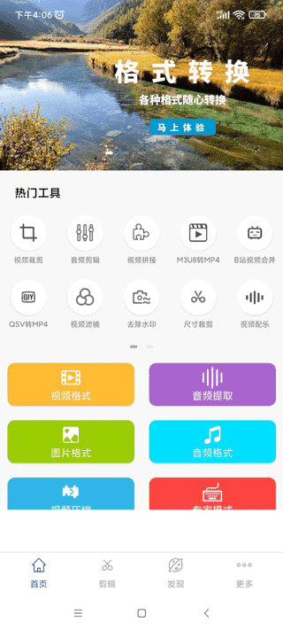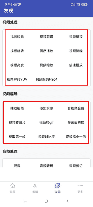 3、切换到“发现”栏目,这里包含了视频转码、片段剪切、水印添加、视频转图片、视频转GIF、音频格式转换、音频提取、图片合成视频等多种高级功能。