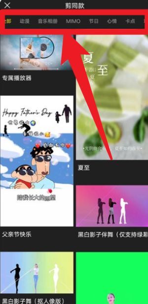 在“剪同款”模块中,用户可以挑选动画、音乐相册、节日等不同类别的剪辑风格,以匹配各类拍摄主题的内容需求。
