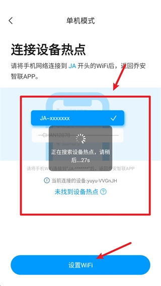 4、搜索以JA开头的设备热点,连接成功后返回App页面,点击“设置WiFi”完成绑定操作。